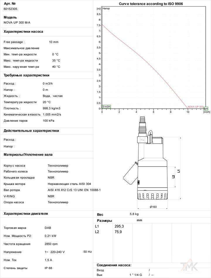 | Максимальный напор, м | 4.8 | |